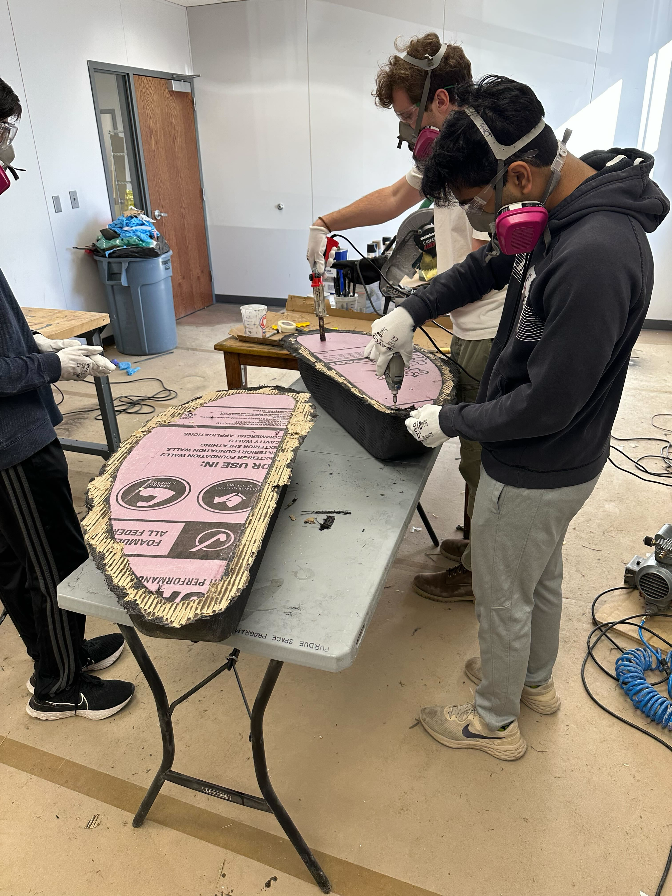 In my role as the head of manufacturing, I oversaw and lead the component manufacturing and assembly of the plane. For the fuselage, a carbon fiber shell with a wooden internal structure held all internal components. The shell was two halves laid up by hand over a positive foam mold, cut out by a CNC gantry router. The internals were laser cut and assembled with 3D printed connections. The wings were cut on a hot wire, and attached using carbon fiber spars. As the team lead, I completed all CNC tool-pathing, as well as guided the carbon fiber layup process.